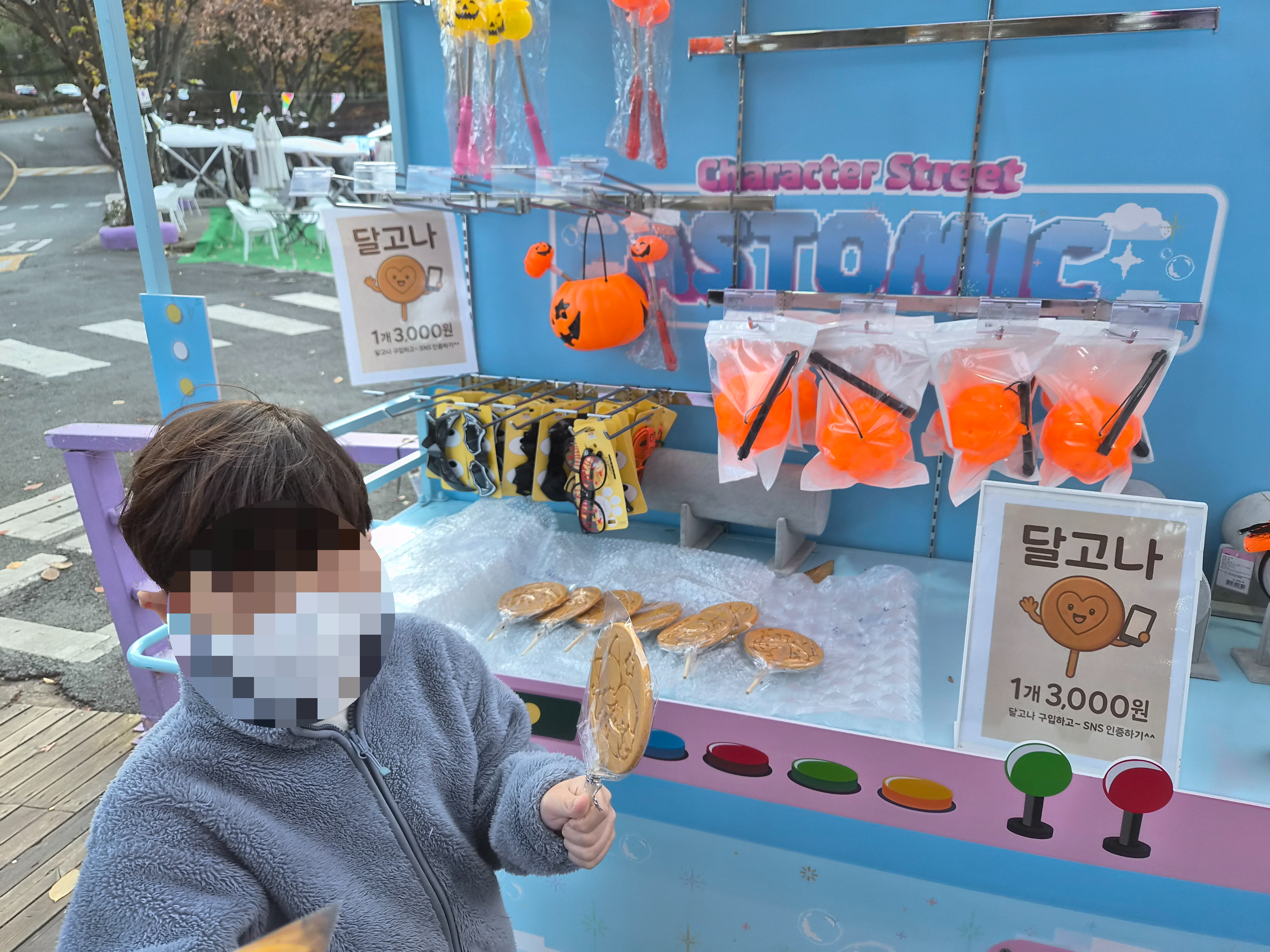 주차장에서 오르막길을 따라 입구 쪽으로 올라오면 키오스크와 매표소가 있어요. 저는 쿠팡으로 할인된 가격으로 미리 입장권을 구매해서 키오스크로 빠르게 입장권을 발권했답니다. 그리고 매표소 맞은편에는 이렇게 아이들을 유혹하는 달고나와 소품들을 판매하고 있어요.