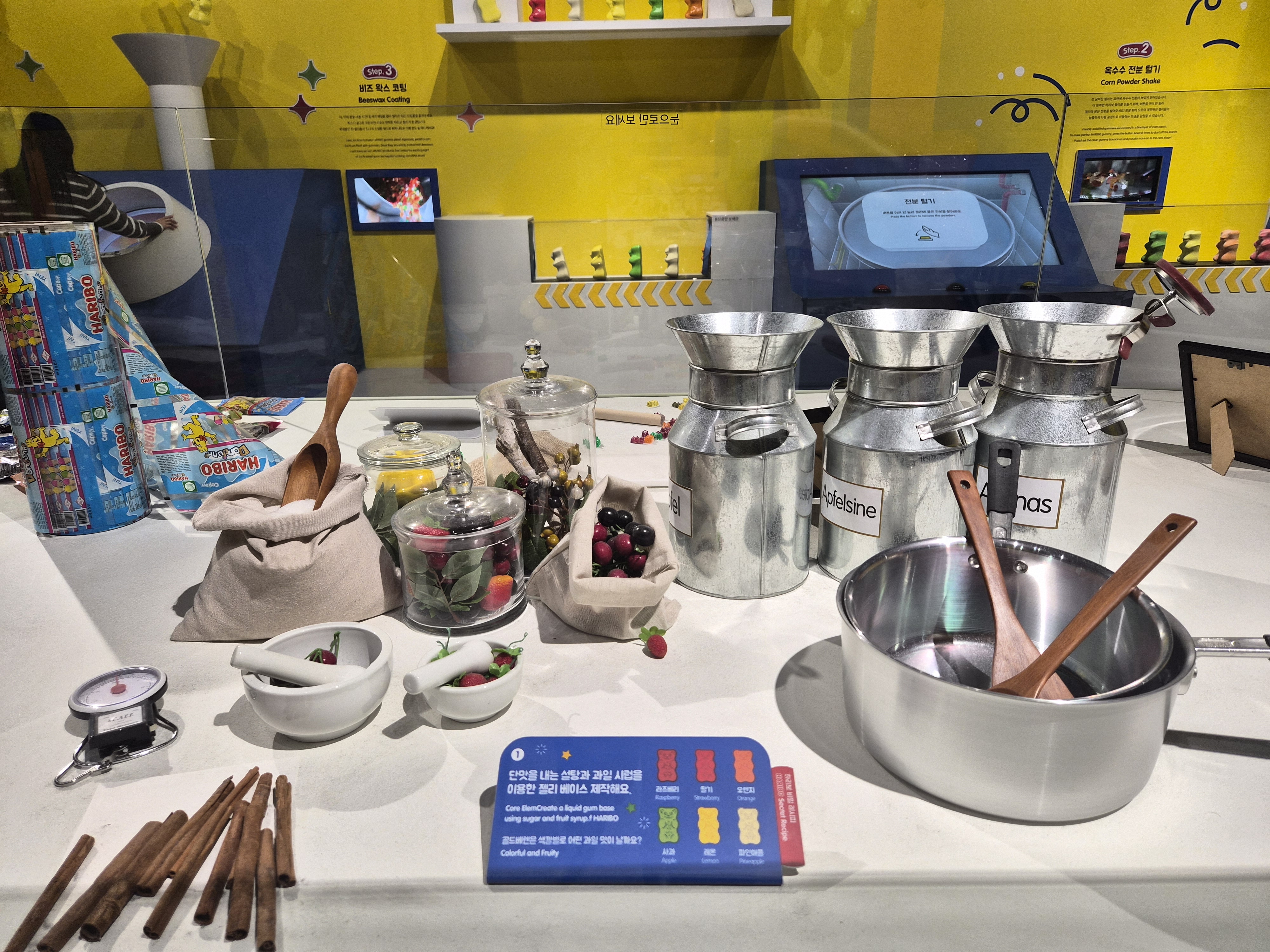 이곳에서는 하리보가 어떻게 만들어지는지 젤리 제조 과정(믹싱,코팅,향료,색소 등)을 직접 눈으로 볼 수 있는 공간이 있어요. 테이블 위에는 다양한 향료, 재료 표본, 시럽 용기, 조리 도구 등이 전시되어 있어서 아이들이 진짜 공장에 온 듯한 기분을 느껴요. 그리고 터치 스크린으로 게일도 할 수 있어서 아이들이 손을 움직이며 체험하기 좋았어요.