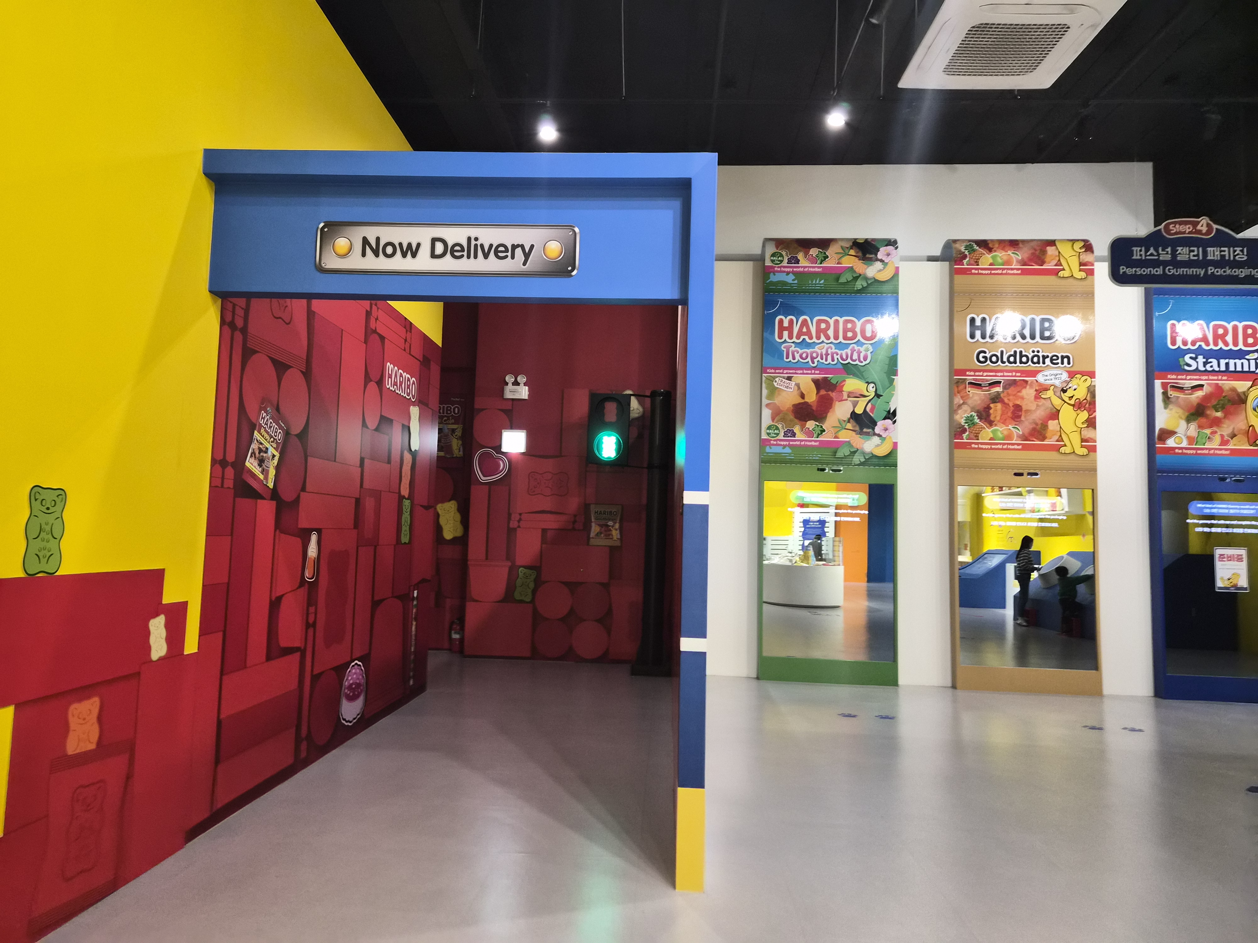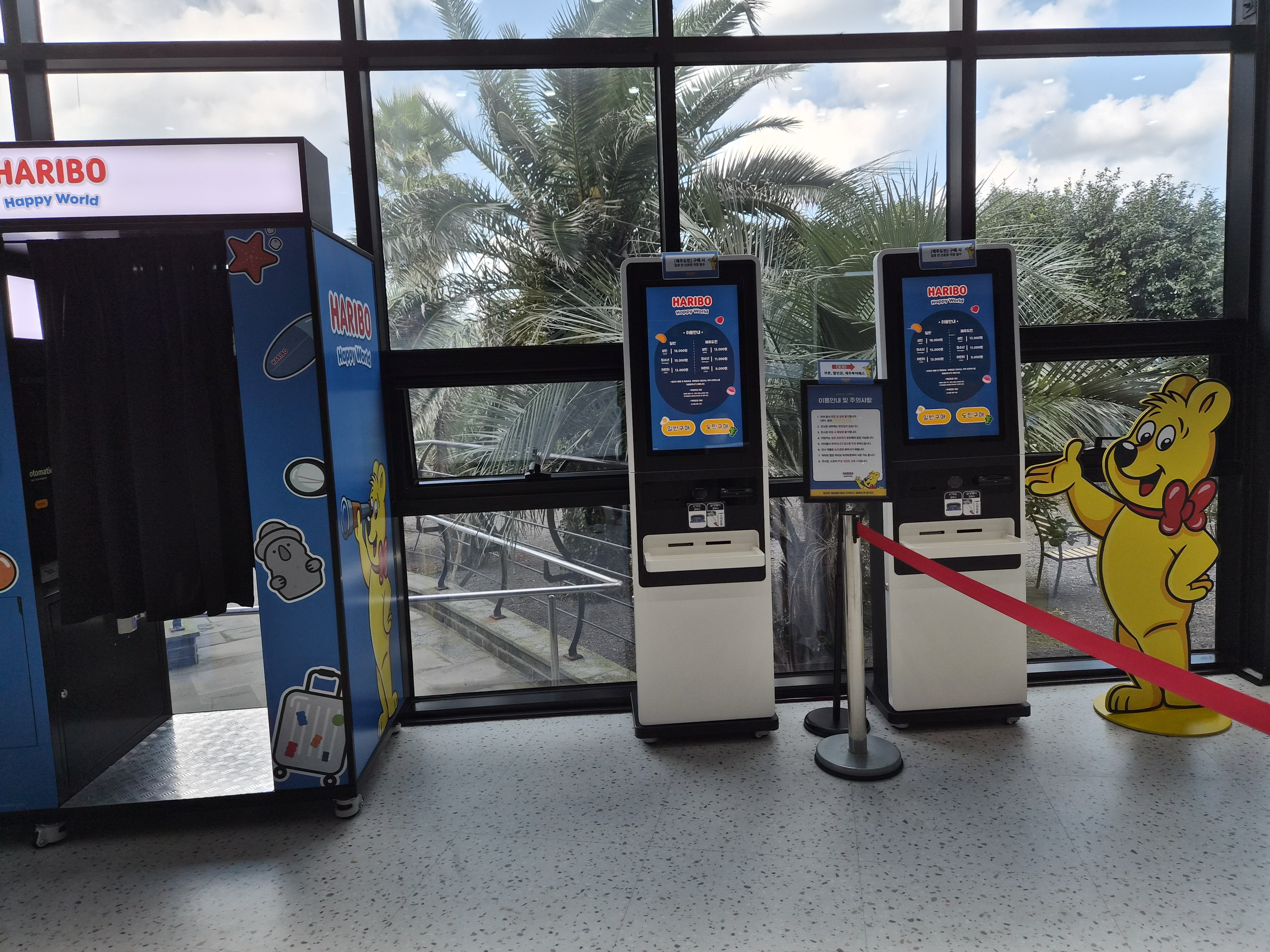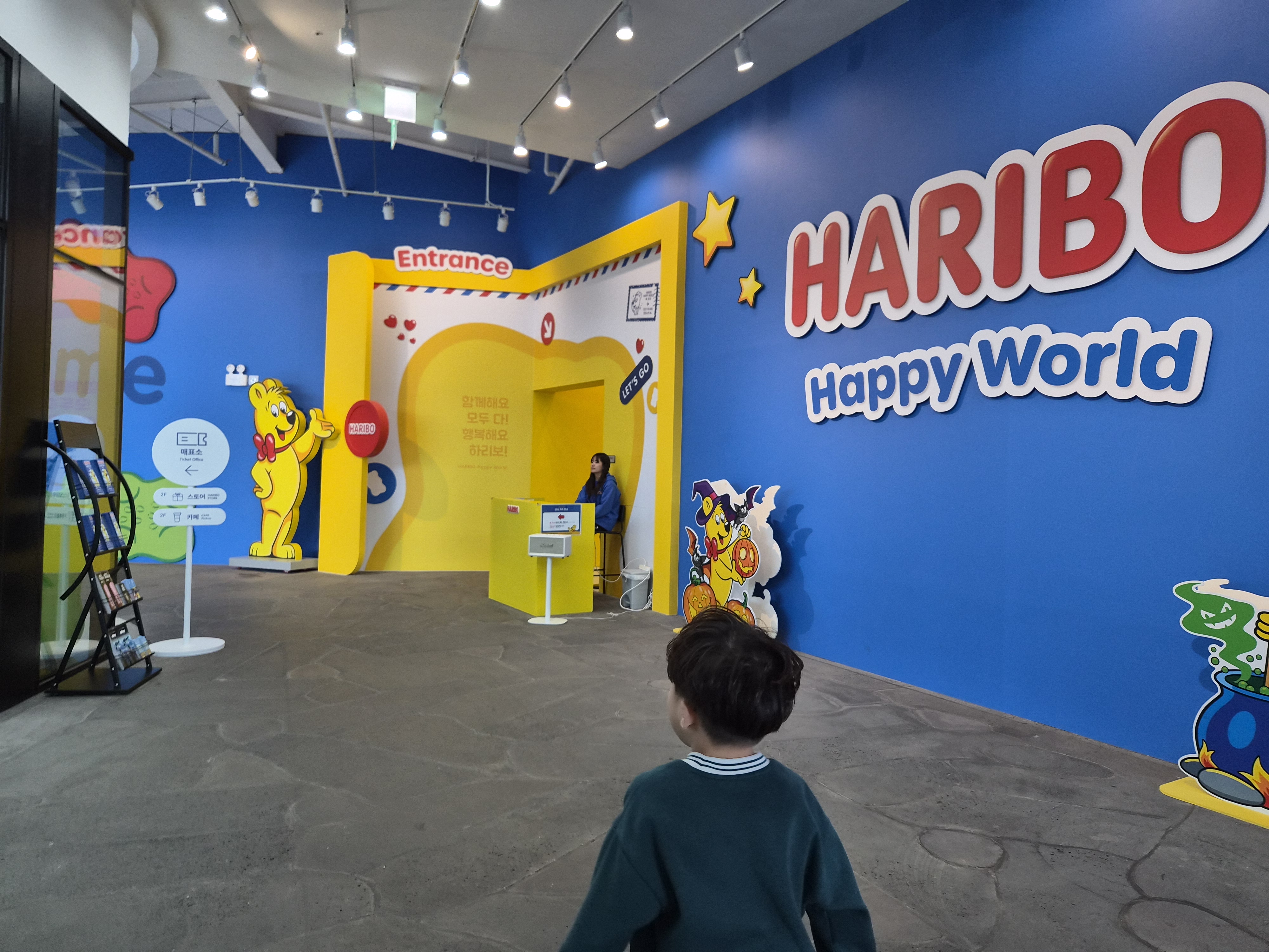 건물 내부로 들어가면 즉시 포토부스와 키오스크가 보이는데, 여기서 간편하게 티켓을 발권할 수 있어요. 아기자기한 하리보 디자인이 반겨주면서 아이들도 어른들도 자연스럽게 기분이 좋아지는 공간이었어요.