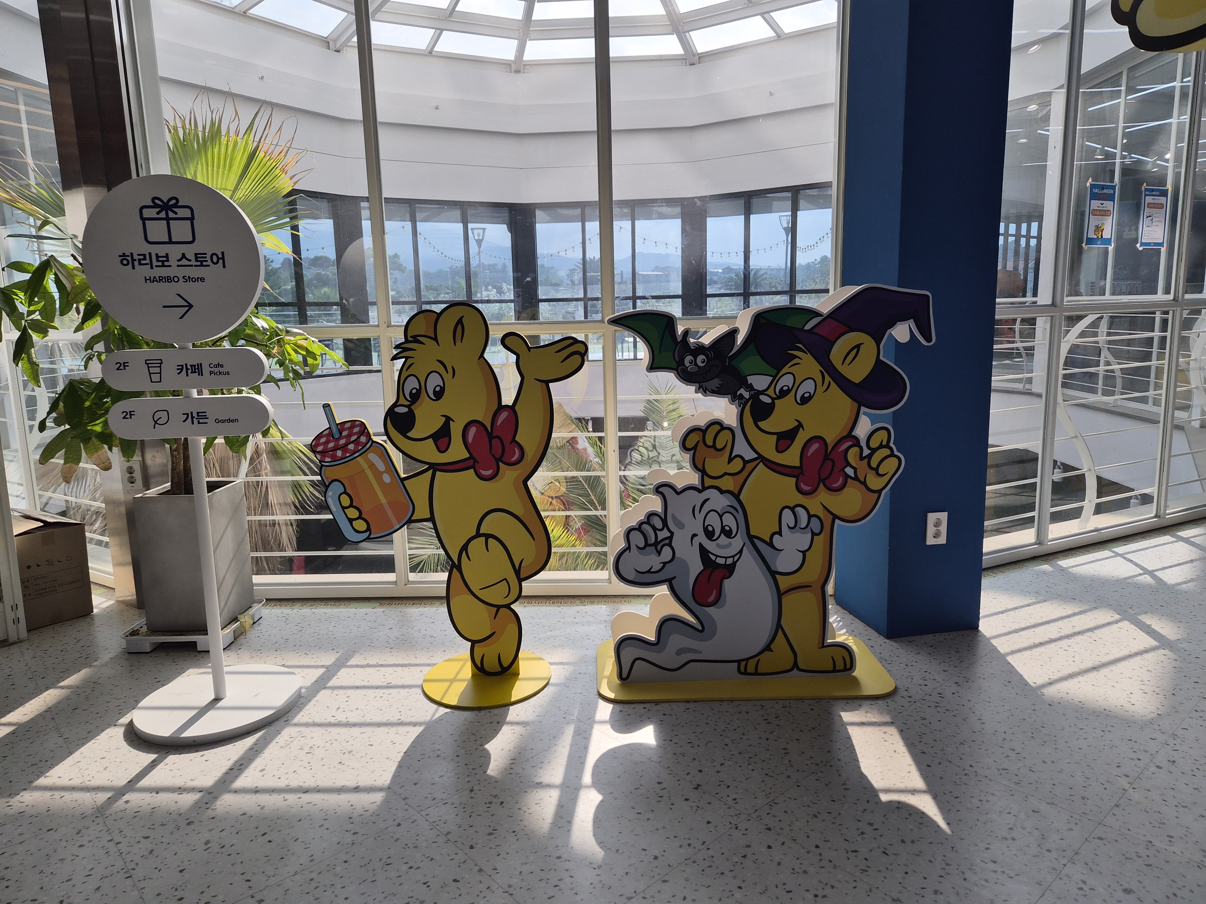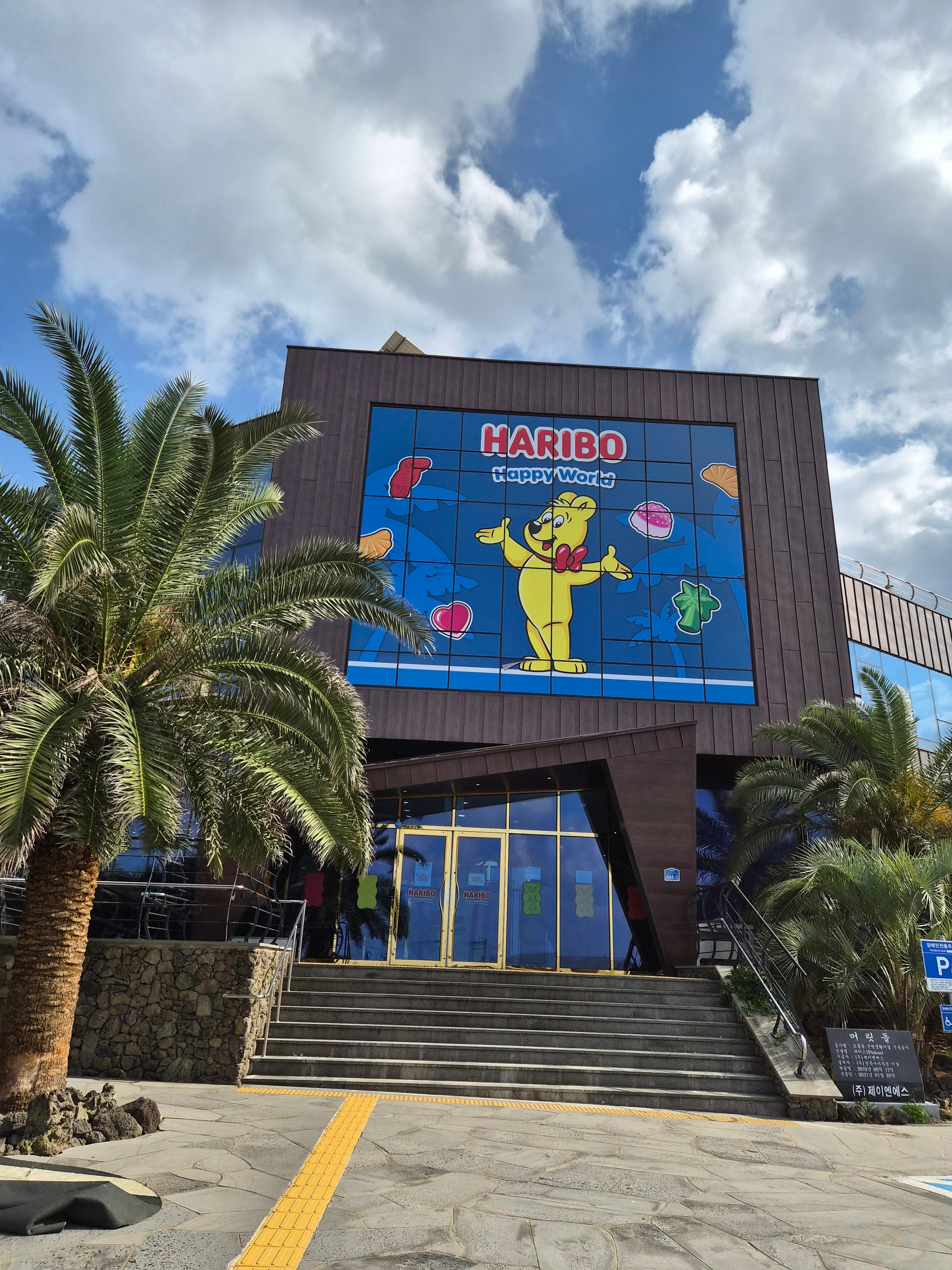 제주도에 새로운 실내형 체험 공간이 생겼다는 소식을 듣고, 드디어 하리보 해피월드(HARIBO Happy World)에 다녀왔어요! 도착하자마자 가장 먼저 눈에 띄는 건 바로 입구 건물 외벽에 크게 그려진 하리보 골드베어 캐릭터! 제주 감성의 야자수와 함께 있어 더 이국적인 느낌이었어요.