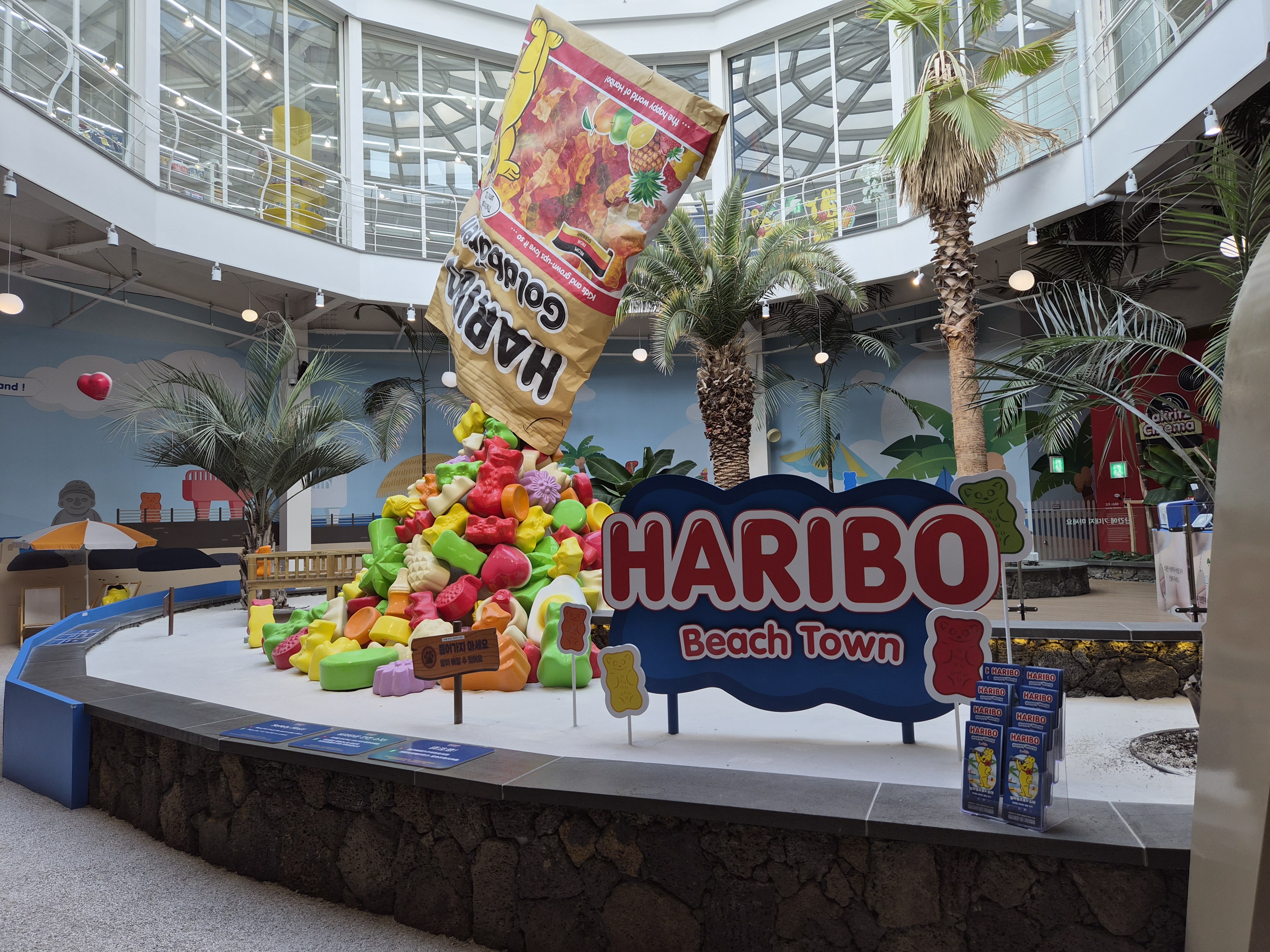 개인적으로 가장 인상 깊었던 공간은 바로 하리보 비치 타운! 거대한 하리보 패키지에서 젤리가 쏟아져 내리는 듯한 조형물이 중앙에 자리 잡고 있어요.
